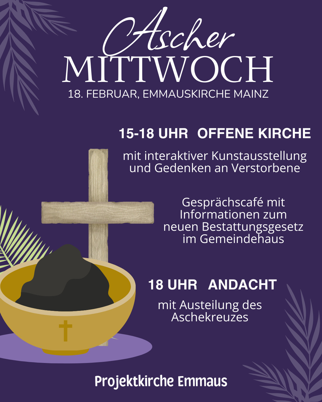 An Aschermittwoch gibt es einen offenen Themennachmittag, der zur Auseinandersetzung mit der eigenen Vergänglichkeit anregt. Hierfür ist die Emmauskirche zwischen 15-18 Uhr geöffnet. Dort findet sich eine interaktive Kunstausstellung mit Aktionen und Impulsen sowie der Möglichkeit, verstorbener Menschen zu gedenken. Im Gemeindesaal ist zeitgleich Raum bei einer Tasse Kaffee oder Tee u.a. über das neue Bestattungsgesetz in Rheinland-Pfalz ins Gespräch zu kommen. Um 18 Uhr rundet eine Passionsandacht mit Austeilung des Aschekreuzes den Tag ab.