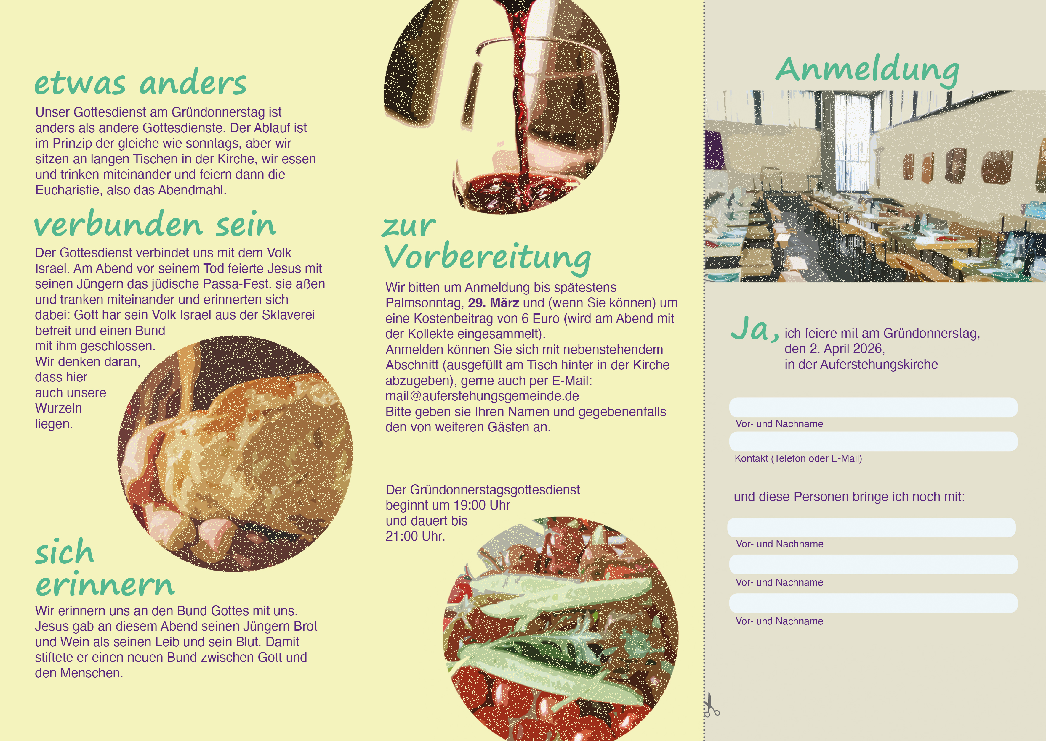 19 Uhr Gottesdienst mit Abendessen und Abendmahl an Tischen in der Kirche (Auferstehungskirche).