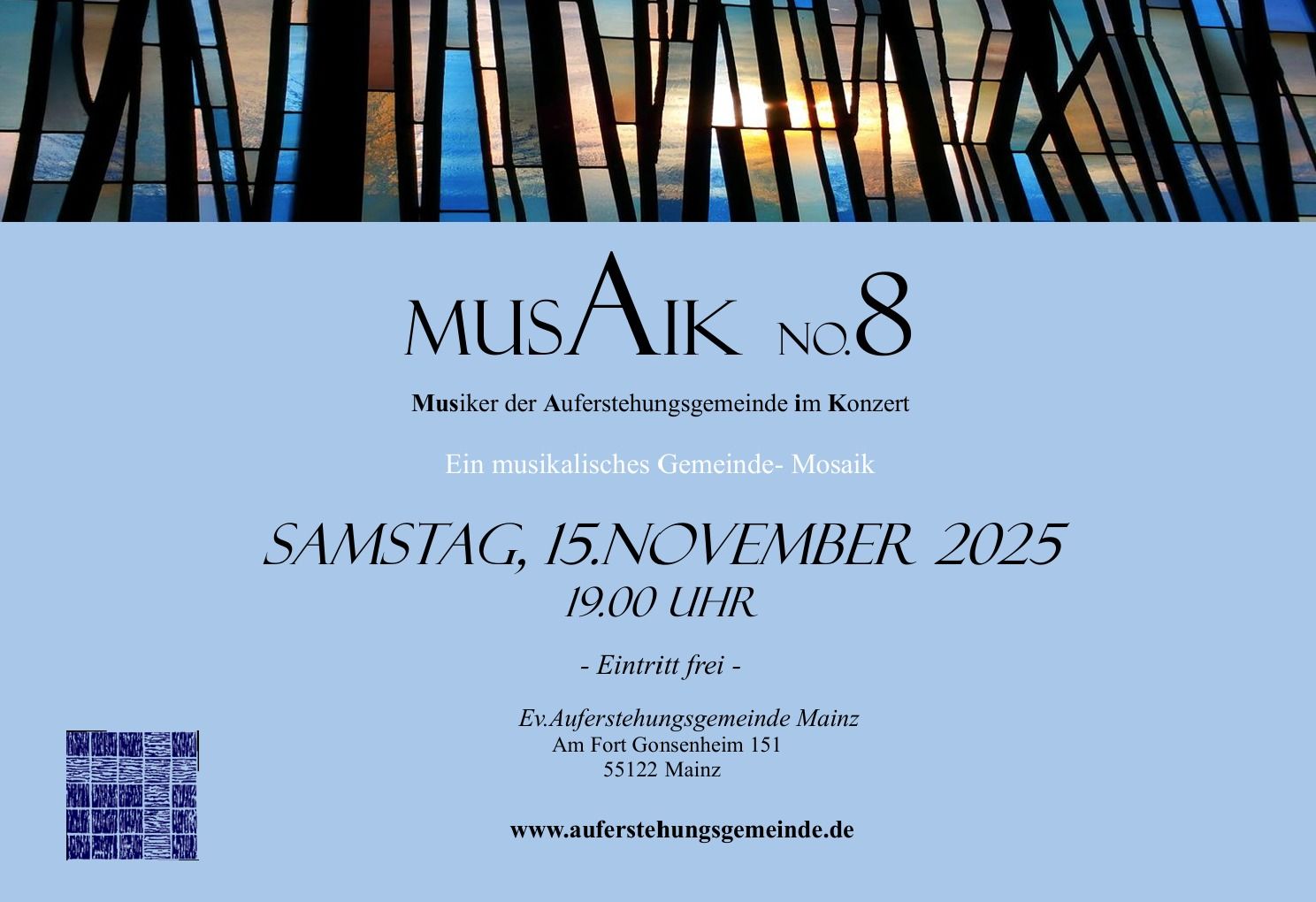 Herzliche Einladung zu MusAik am Samstag 15.11.2025 mit einigen Musikerinnen und Musikern unserer Gemeinde, Freuen Sie sich auf ein musikalisches Gemeindemusaik ab 19:00 Uhr in der Auferstehungsgemeinde! Der Eintritt ist frei!